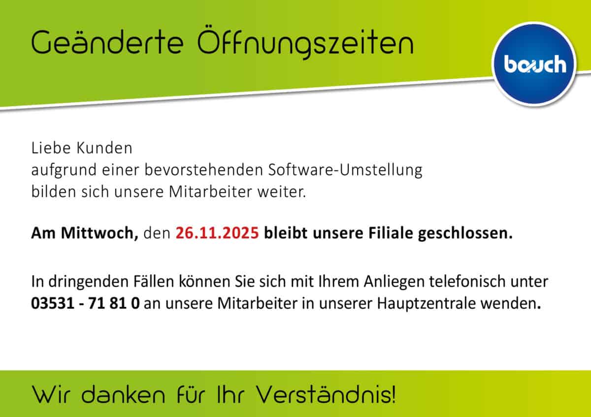 Am 13. und 14. November 2025 bleibt unsere Filale geschlossen. In dringenden Notfällen sind an diesen Tagen unsere Filale Finsterwalde und/ oder Herzberg die nächstgelegenen Filialen